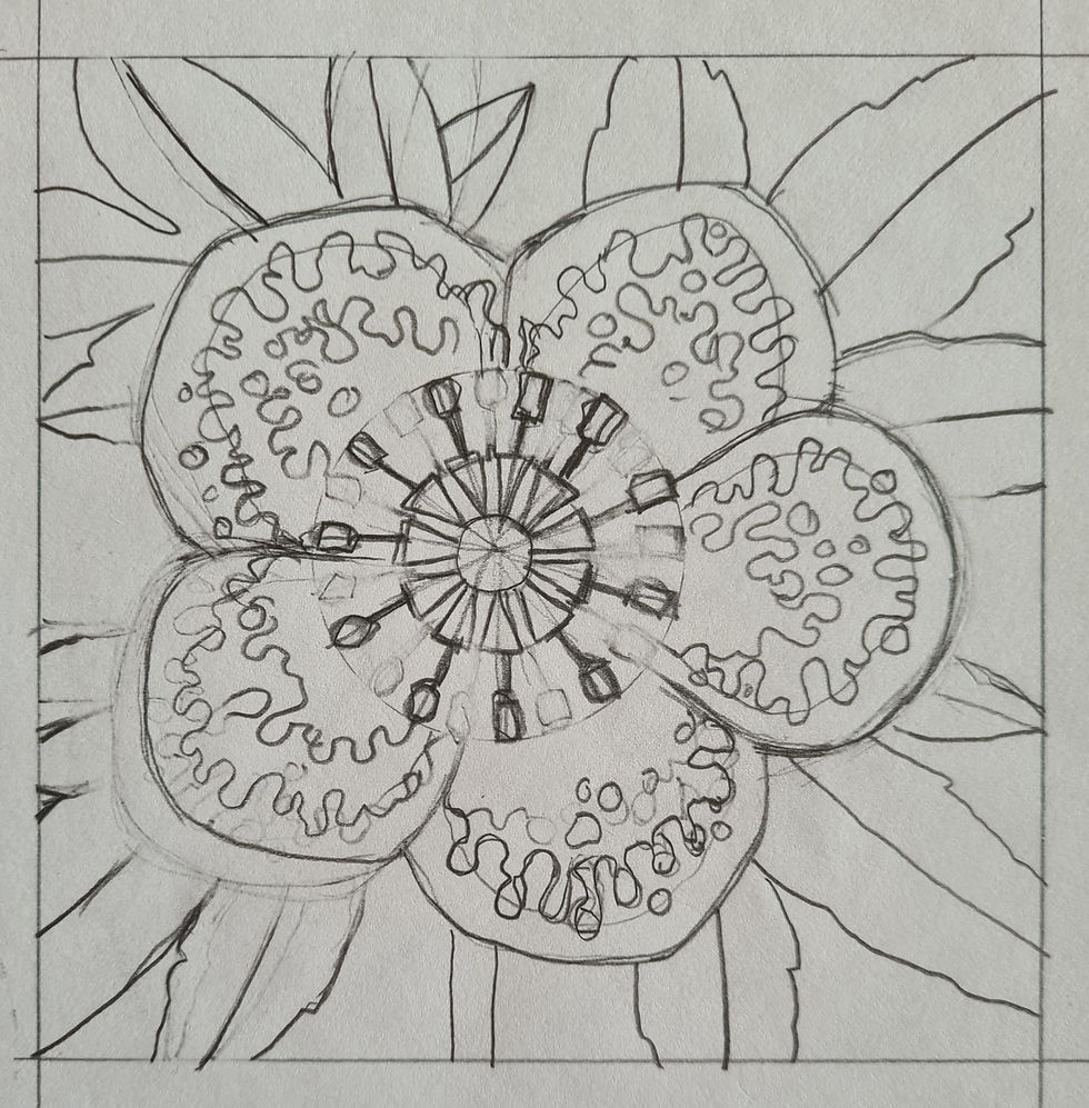 I started by playing around with composition and detail. I wanted the print to be small 125 x 125mm so I knew I needed to keep the design fairly simple if I was to carve it accurately. I didn't want the design to be photo-realistic and was keen to stylise the seed heads and the pattern on the petals. The drawings below show my ideas. The one far right is the final idea.